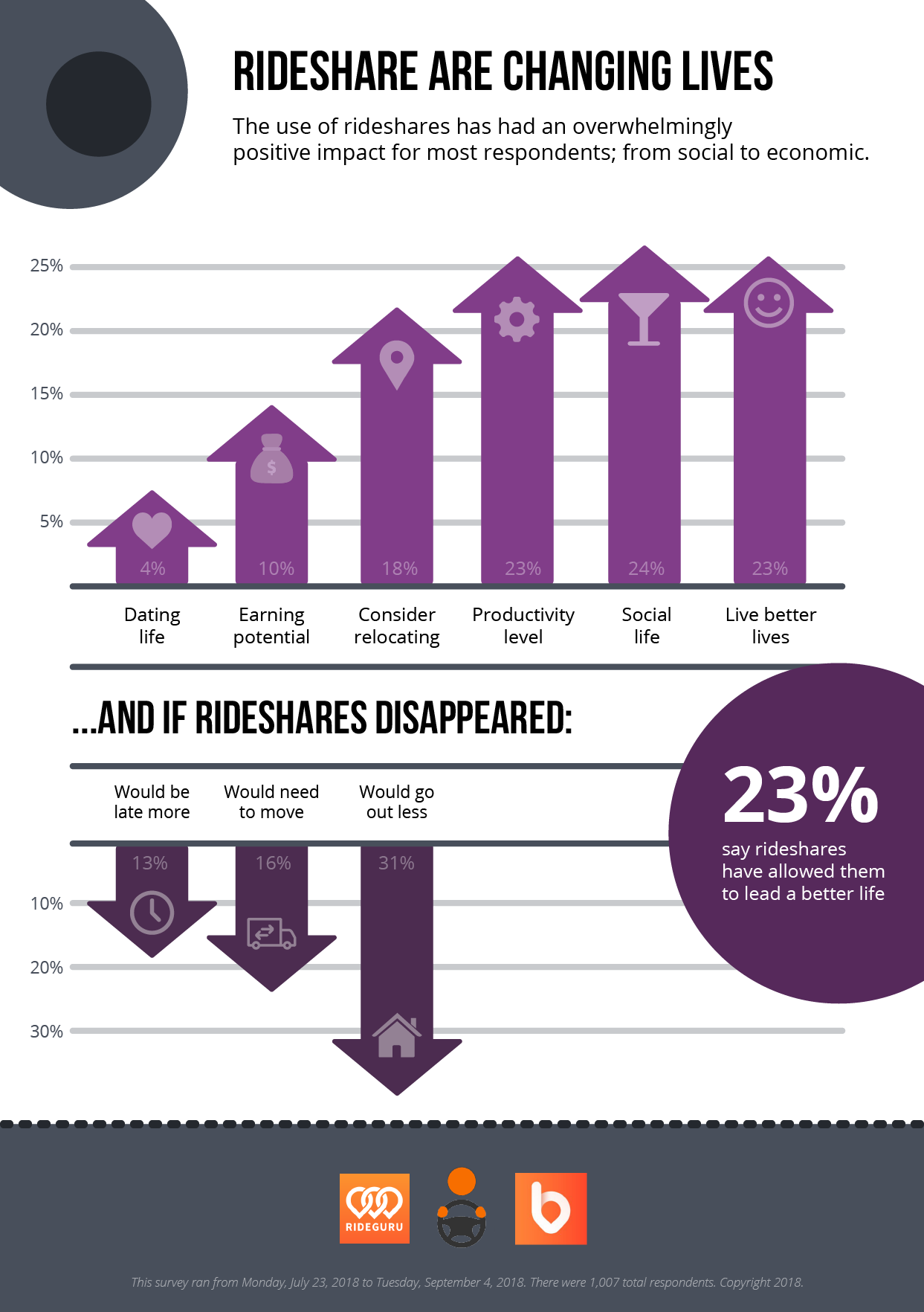 Rideshares are changing lives. And they are changing lives for the better. In a recent study, we polled over 1,000 rideshare users to gain further insight into how our society uses and views on-demand transportation. One main takeaway we found was that riders in general view ridesharing very fondly. In fact, 23% of respondents claim that ridesharing allows them to lead better lives.
