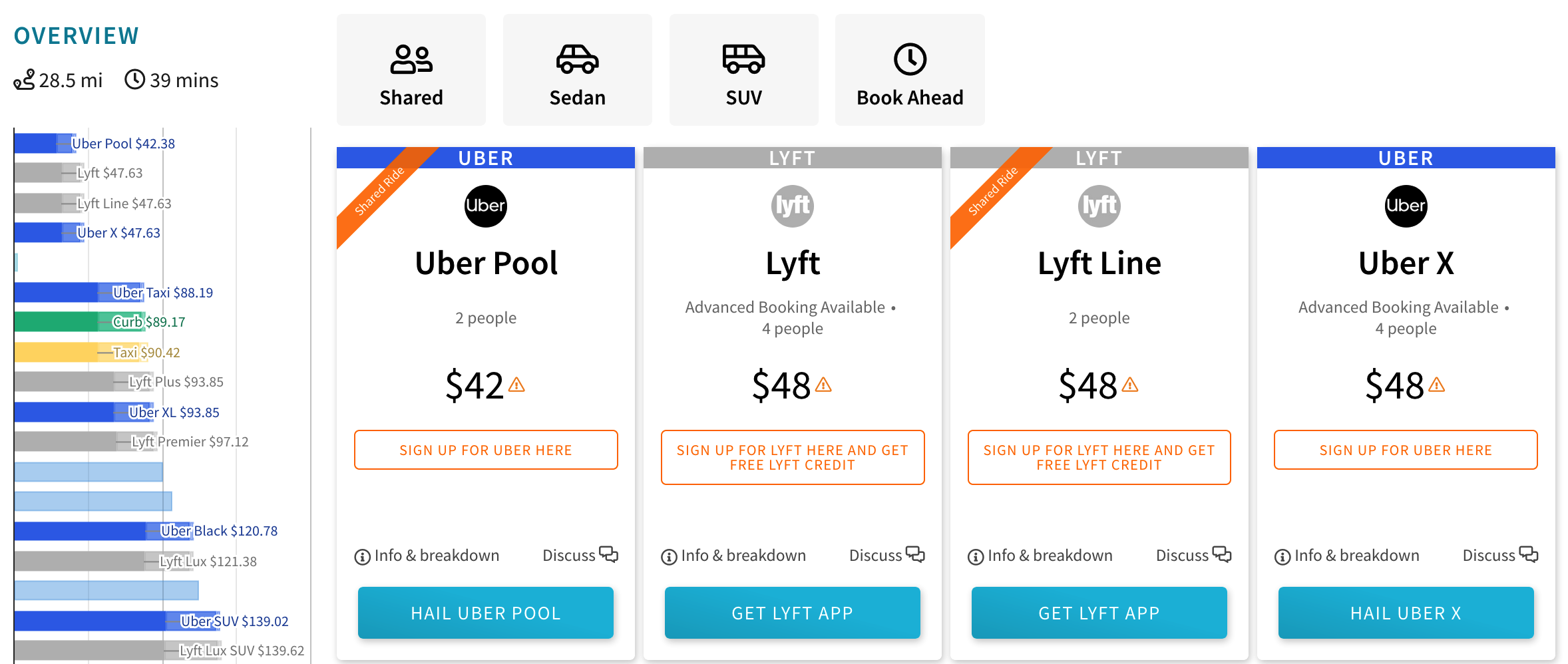 Take a look at the "Overview" chart to easily see the available ride options and prices in one convenient place. For a further breakdown of each service look under "Fare Details", where you will find a cost analysis of each service, the amount the driver will actually make from your trip (the rest goes to the company), and information on the type of car you can expect to receive with each option. If you would like further details on any of the companies simply click on the company logo. Furthermore, if you are interested in how much each ride would cost if surge pricing was enacted, simply use the calculator under "Surge Pricing" to increase or decrease the surge pricing factor. Prices will automatically be adjusted to reflect the higher surge pricing.