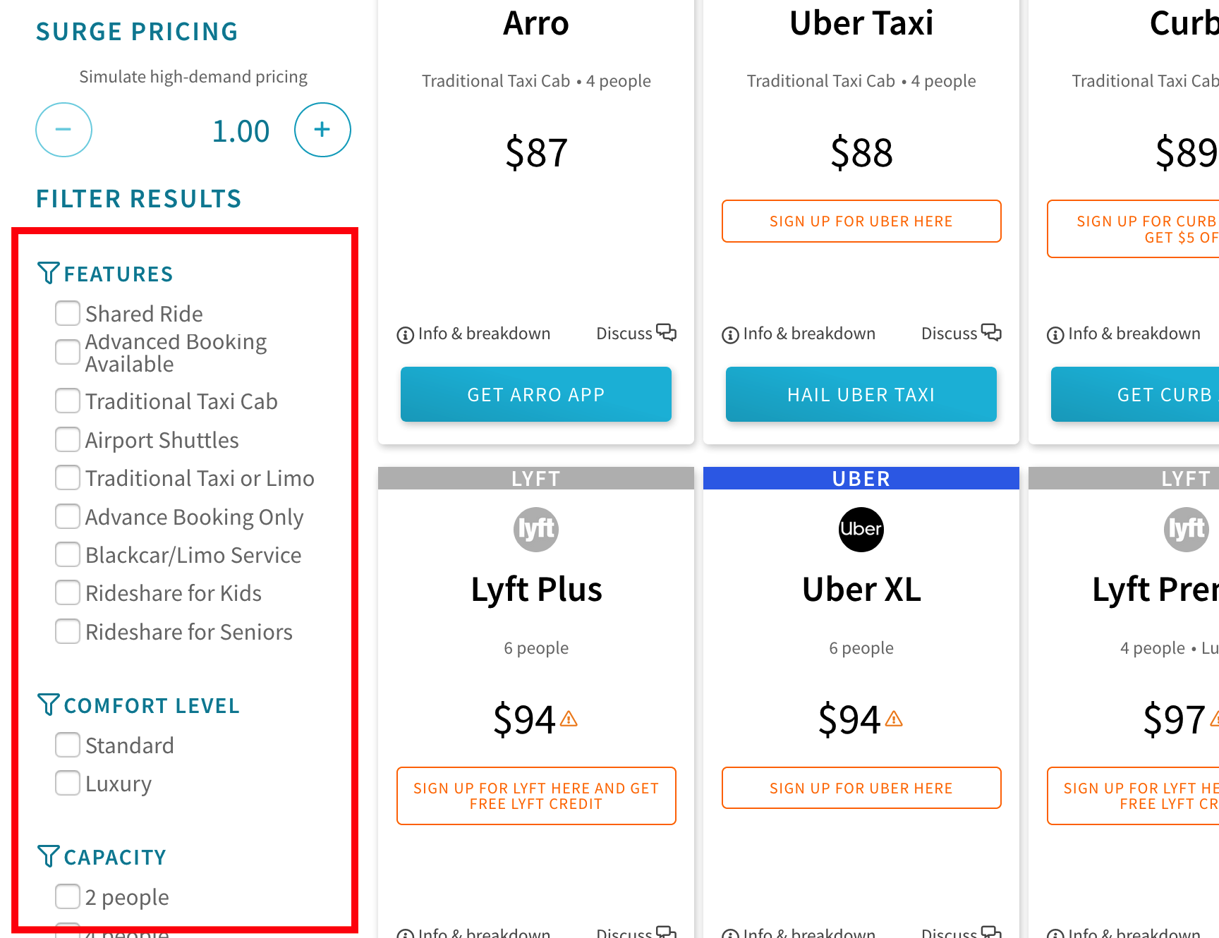 Pro Tip: If you are unsure which ride is right for you, simply use our "Filter Results" feature on the left hand side, which allows you to narrow down your ride results by provider, quality, and capacity.