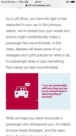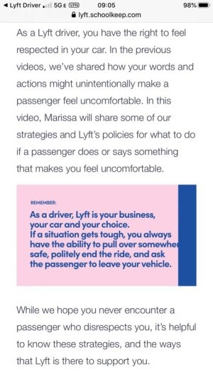 In the screenshot above, we see more education on exactly what a driver can and can’t do in order to deal with an intrusive or threatening situation, Lyft is reminding drivers that they always have the option to pull over, end the ride and politely ask the passenger to leave the vehicle.