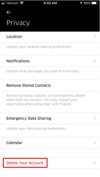 8. Finally, Uber will direct you to one last page trying to convince you to not delete your account. If you are certain you would like to delete your account click Delete to finalize the process.