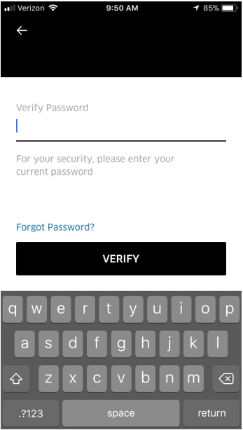 6. Once you have tapped on Delete Your Account, Uber will ask you to verify your password. Enter in your password in the field given and tap Verify.