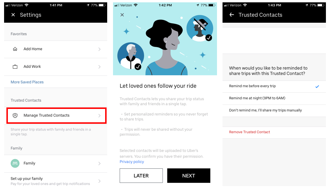 With Uber's Trusted Contacts, riders are able to designate up to five friends and family members within their app as Trusted Contacts. When a ride is requested the user will be prompted to share their trip details with their trusted contacts. This helps to ensure that others know your location and when you have arrived at your destination safely.