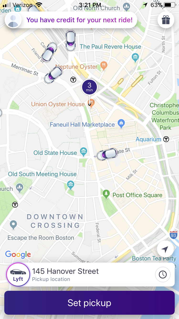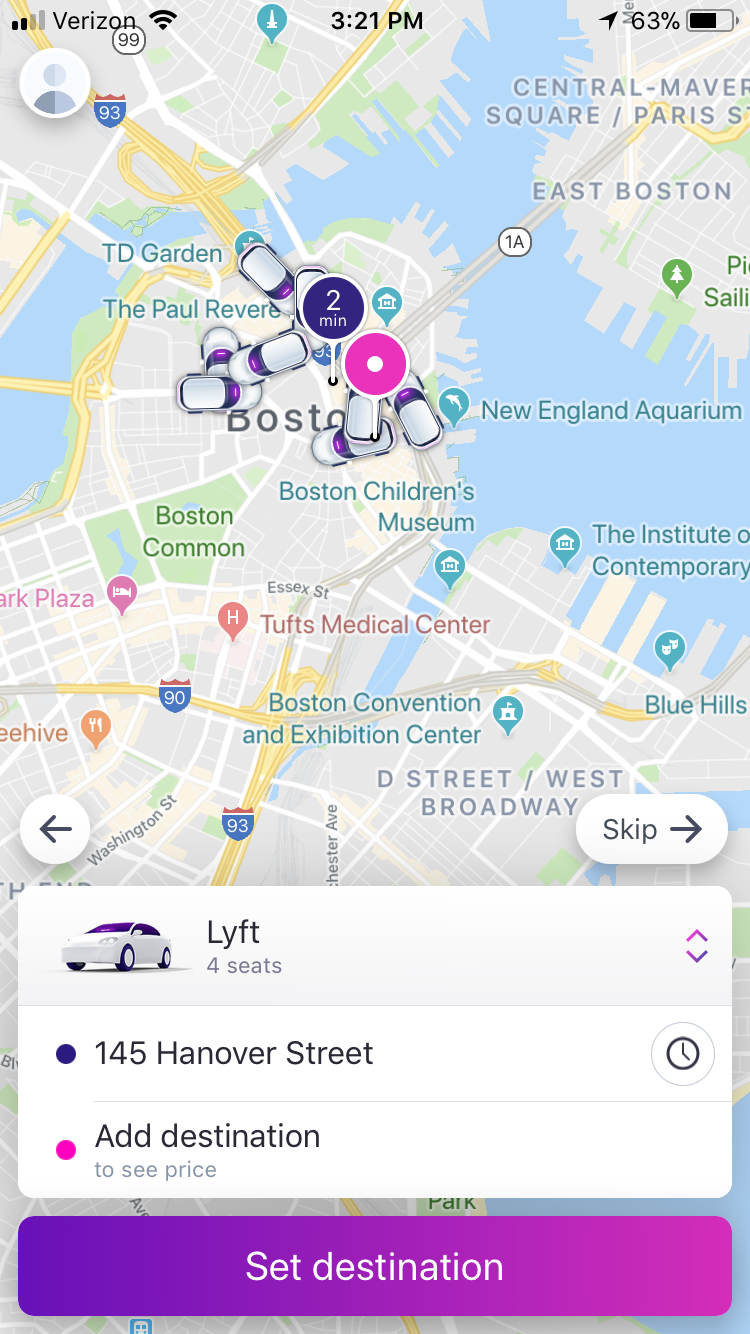 Lyft’s interface is pretty straight forward. Upon opening the app, you will see a map of your immediate area with a pin in your location. TIP: Make sure to turn on location services for the Lyft app!