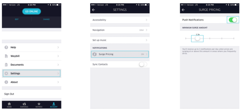 You can also permanently turn on surge notifications if you want to always be aware of the current surge. You can do this through the settings in your Uber app. Under your account, press settings, and select the option that says "surge pricing". There are options to select the minimum surge price you want to receive notifications for, and turn on push notifications.