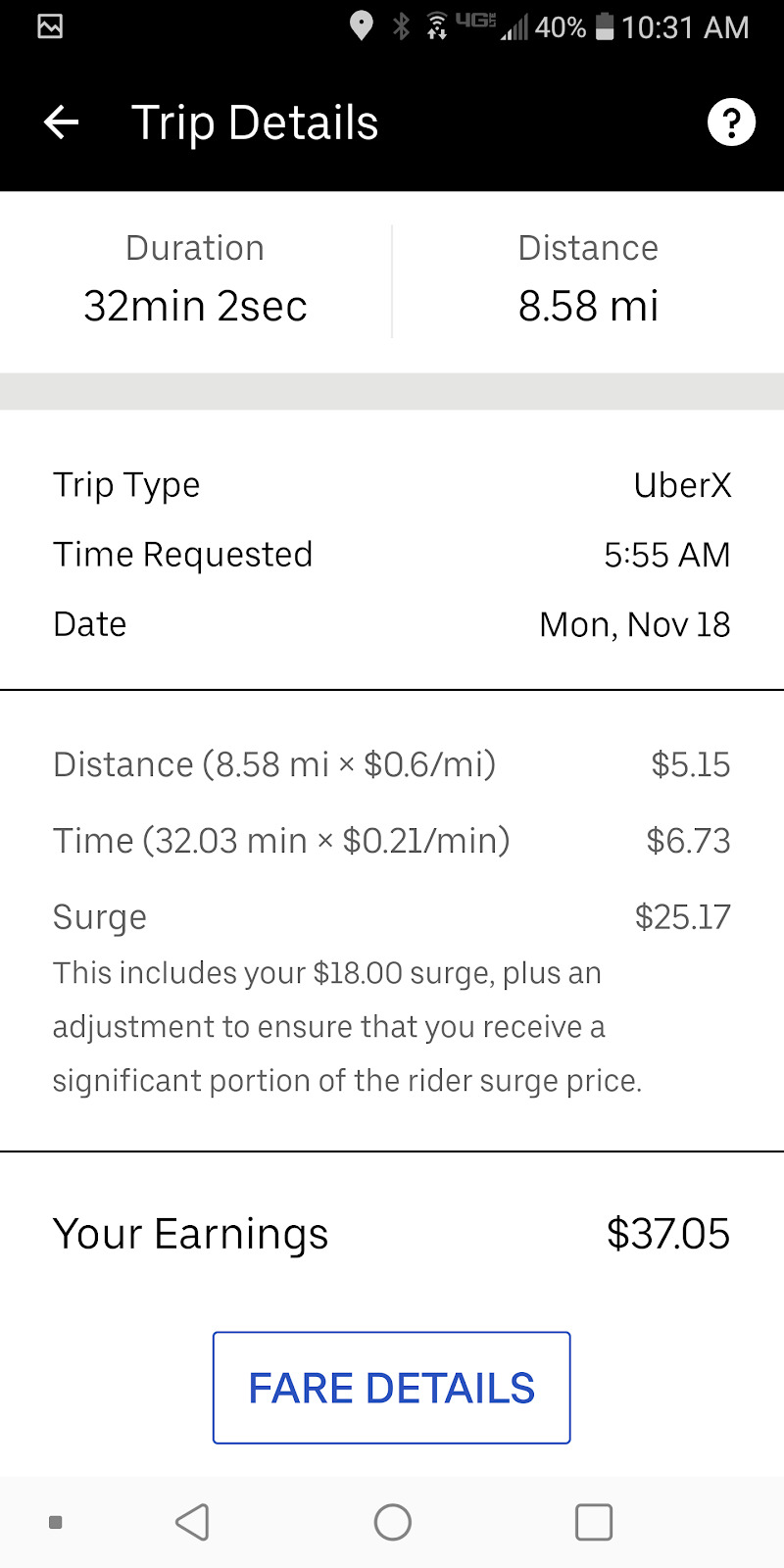 As seen below, Uber still keeps up with their end of the bargain by informing the driver with a detailed breakdown of what the passenger paid for the specific ride.
