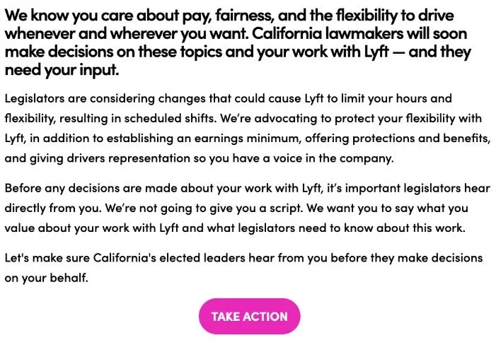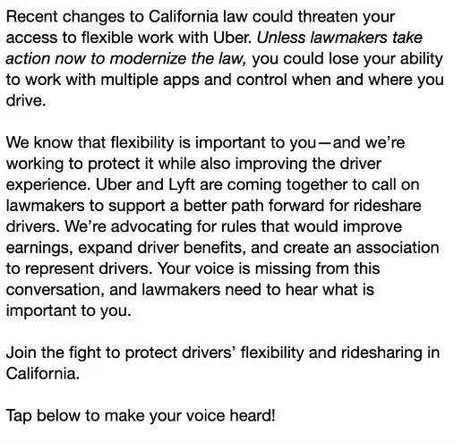 They're also sending coercive messages through their driver’s app to mislead drivers in order to collect as many signatures as possible to oppose the bill. Here’s an example of what the drivers are receiving: