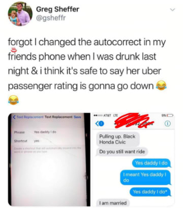 A friend, a prank, and autocorrect leads to bad passenger ratings.