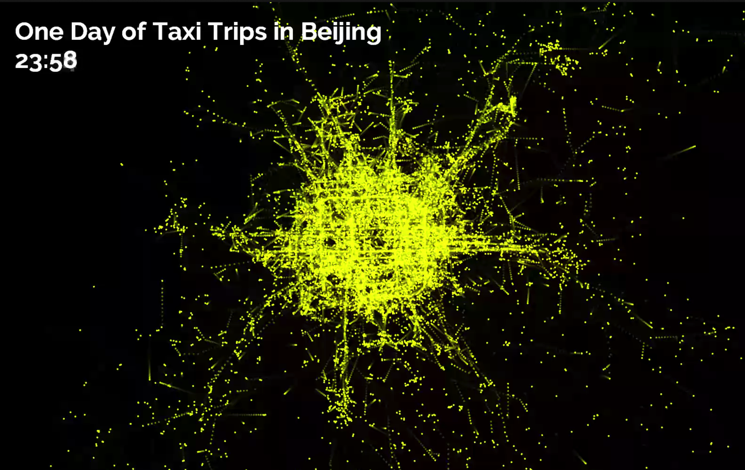 Check out this cool visualization of a day of taxi trips in Beijing. Talk about busy huh! Click on the image or this link to see the video.