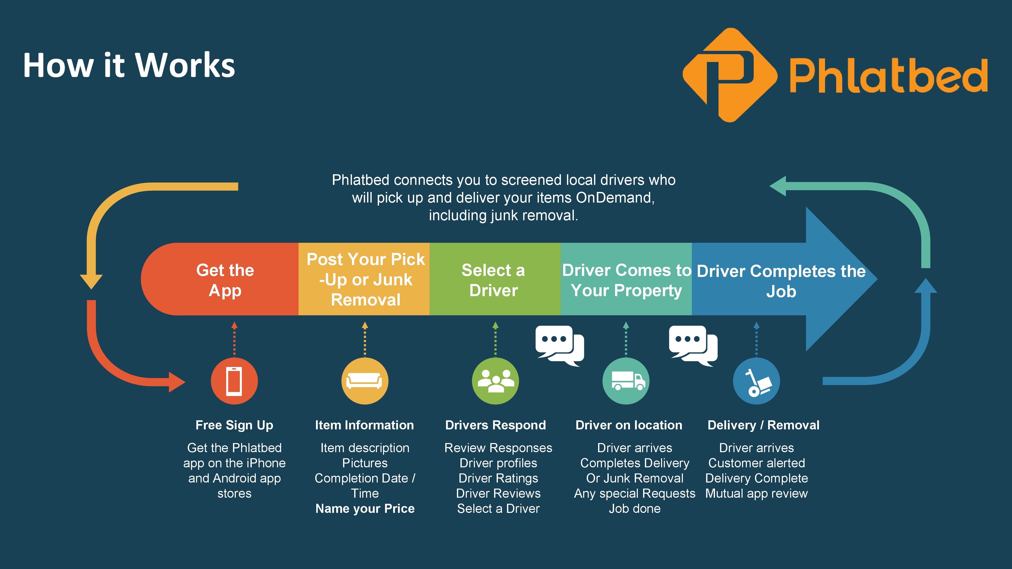 Simply post your item, add a few images, add your Source and Destination Addresses, Name your price, and you’re good to go! This is only possible using Phlatbed , the ondemand app that connects you to local drivers who will pick up your marketplace items and deliver them to you. It also includes junk removal on demand!