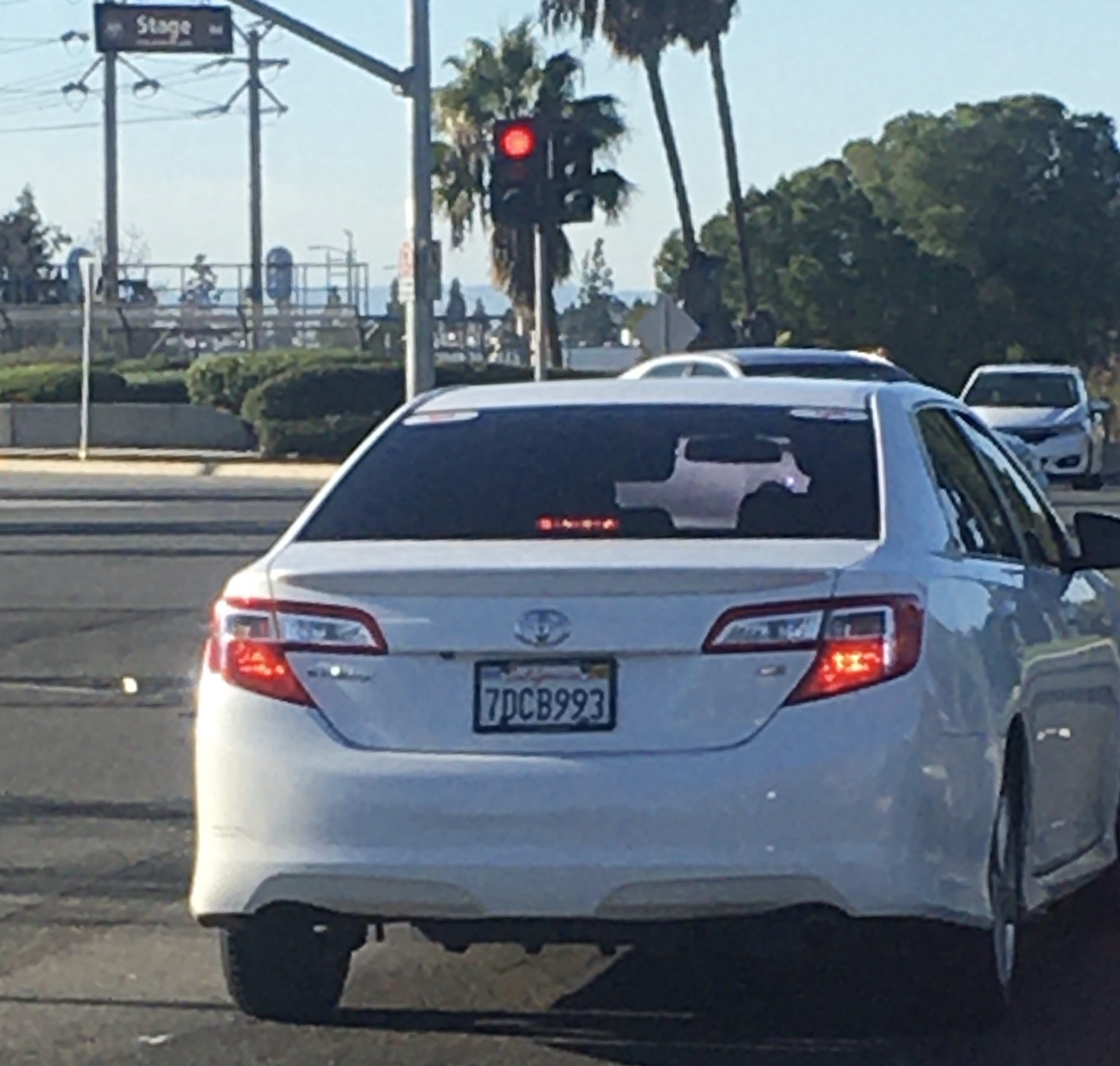 Sunday 12/15/19 2:56pm La Mirada, CA. Beach Blvd and Stage Rd. With my fiancé and our 3 year old daughter White Toyota Camry limo tint Lic Plate# 7DCB993 with identifying Lyft stickers. Driver was a white male early to mid 30s erratic driving and extremely agressive/hostile behavior possibly drug induced. While I was turning at a green left turn light onto stage rd from Beach Blvd driver ignored his red light. Without stopping or attempt of slowing down made a swift right turn cutting me luckily I avoided side swiping his vehicle. I honked my horn and immediately driver slammed on his brakes and flipped me off. As we proceeded forward lane split from 1into 2 lanes. While I was in the right lane driver decided to use his car and attempt to make me run into the curb and trying to blocking me in. Driver then parked and got out with a weapon of some sort possibly a crowbar. I quickly escaped from this psychopath. At the next light at alondra and stage I swerved last min to the right while his was waiting for left turn this is when I snapped a pic of his vehicle. This guy needs to be locked away and throw the key away.
