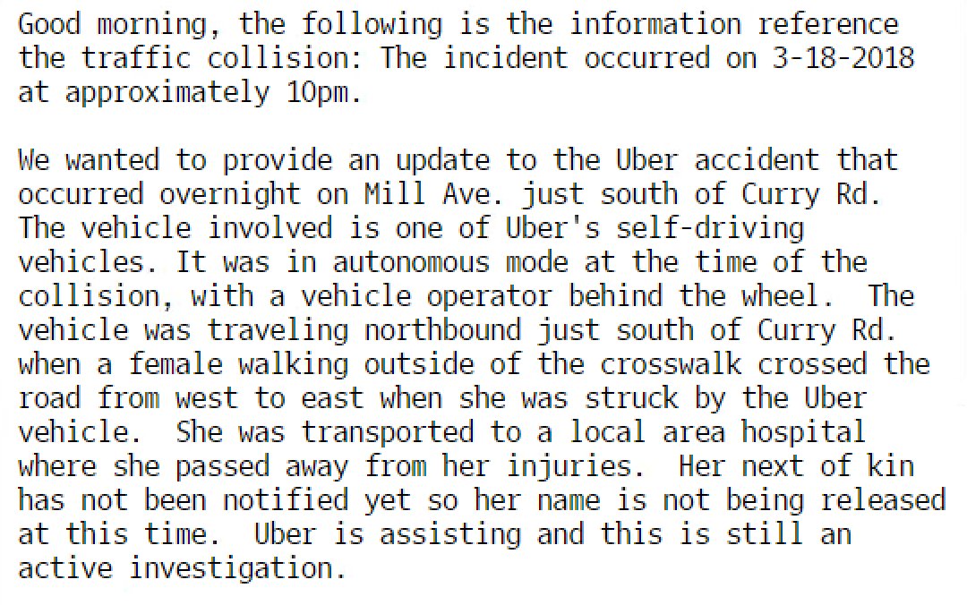 Self-Driving Uber Car Kills Arizona Pedestrian via the NYTimes.