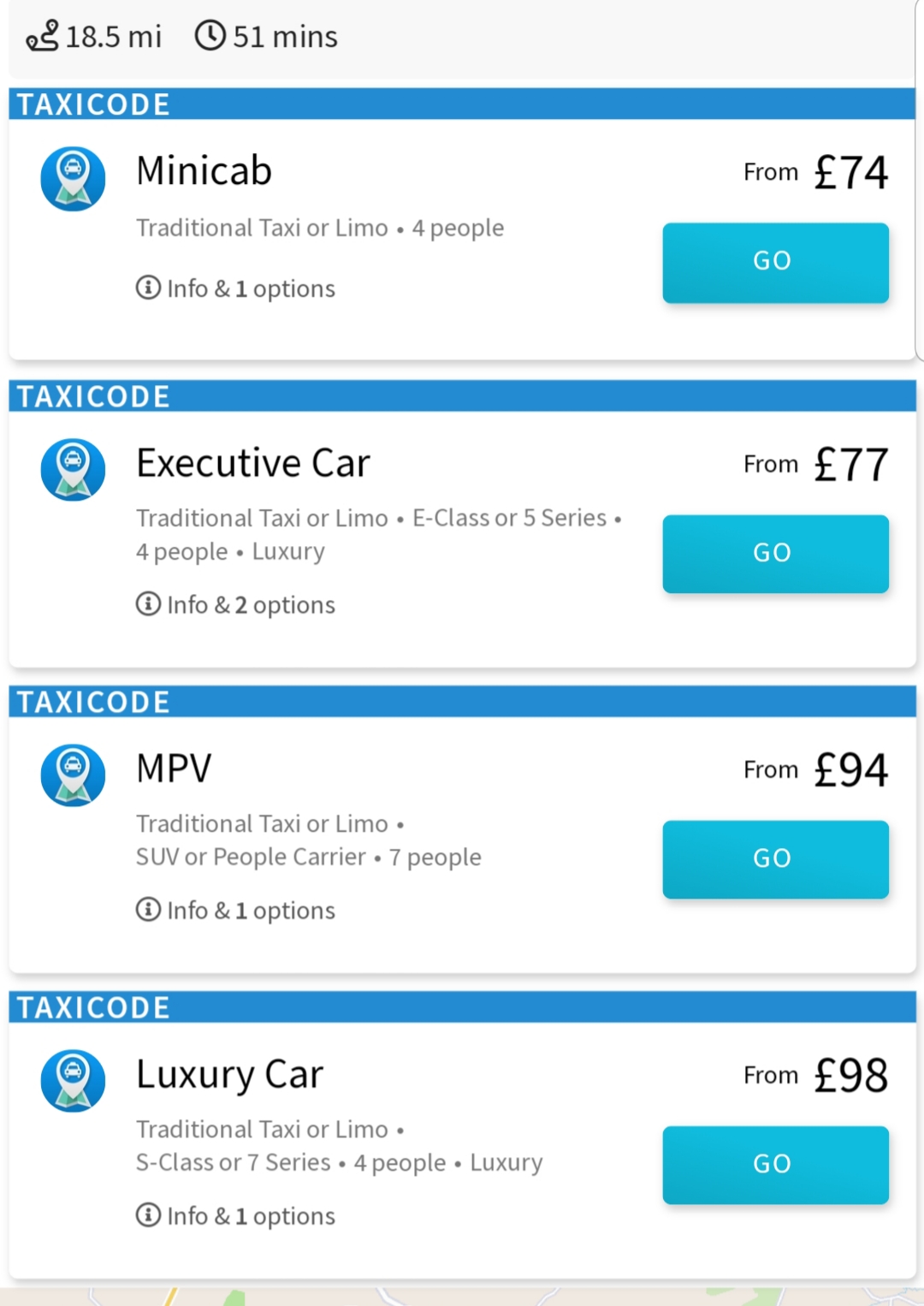 I am not a guru and not familiar with the UK. However I frequently use this site for the forum & my rideshare needs so I thought I would try to help. There is a ride fare calculator that you can put your location and destination in and it will then give you options on whats available and the price. Click on "RIDE" at the top left of this page. Hope this was helpful:)
