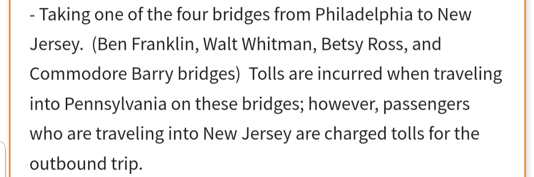 I pulled this off another thread on this site, see below. Most trips from Philly into NJ via one of those bridges I have received the toll. There has been 4 rides that Uber will not give me the toll for. Last night took rider from Philly into Cherry Hill. I was sent over the Ben Franklin. I clicked the "stop requests button" last 4 min of trip as Uber kept sending me request and it got distracting while I was trying to get rider to destination. After drop off I stayed off app as I just completed 2 45+ min trips I needed gas, rr, and mac machine. After taking care of that I went back on app put destination filter to home in Philly as I was done for the night. Uber refuses to pay my tolls. As I said most times they do pay without me asking but got screwed on 4 other trips and the one last night. Anybody know without a doubt if they are responsible for my toll? If so please share where this can be found.