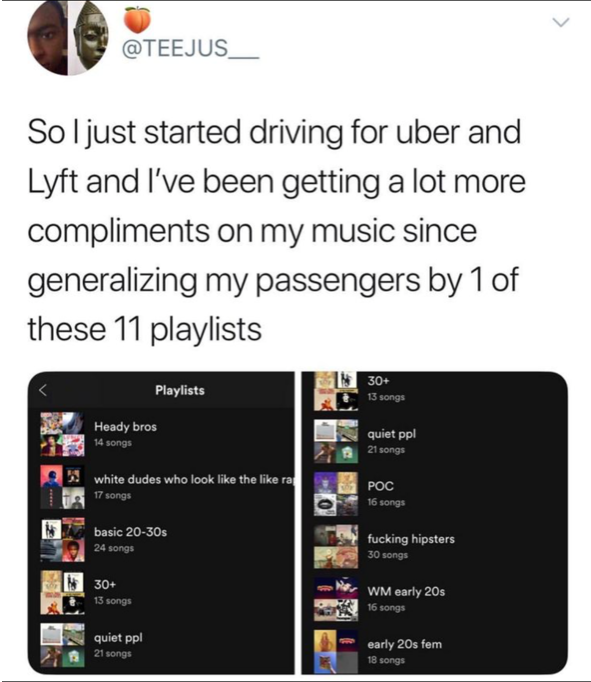 Genius and easy way to boost your driver rating. Trouble finding that perfect tune, categorize them like this guy, i.e. per passenger generalization. Ha!