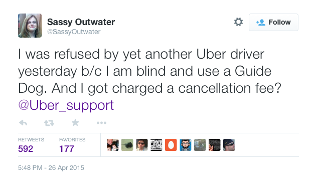 I would never decline a blind person. With a seeing eye dog... although to be fair, if it was huge, that might be a problem. If it was dirty or musky, I carry towels and even a small tarp and might insist you let me lay them out for the dog to rest on. Perhaps Uber is weeding out better quality drivers by whiddling down our earnings and Stealing wages on the DM rides. The thought of having to shut down the app, and clean the car... could possibly excede the cost of the ride, but i doubt it... It is a shame. Sorry to hear she had to go through that... And then to be charged... some drivers have no shame. Hope it was an accident...