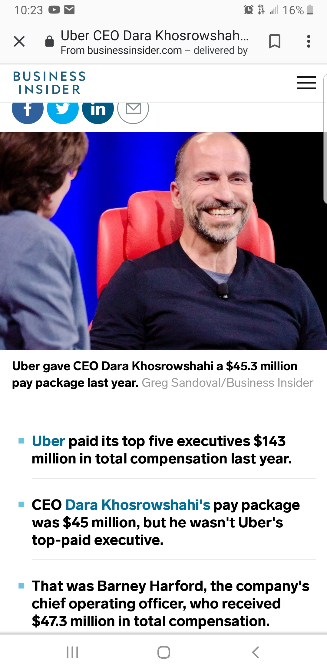 Dara looks so happy. Guess I would be happy also. The only difference is I wouldnt be cutting rates on drivers the way he does. Drivers keep this company in business. Without them there wouldnt be UBER and Dara wouldnt be making that huge salary. Just another slap in the face to drivers. Drivers are making under .70 per mile and under .20 per minute (in most markets)and Uber claims they are operating at a loss. Dara still making a fortune though. When Uber first started drivers were making 2.25 per mile now its down in my market to .69 per mile. On some of our trips Ubet is making more or a few dollars under our fare. What happened to 20%/25% for Uber and 75%/80% for driver? What ate your thoughts?