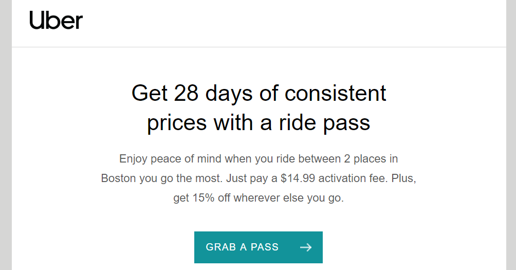 It says, "Get 28 days of conistent prices with a ride pass. Enjoy peace of mind when you ride between 2 places in Boston you go the most. Just pay a $14.99 activation fee. Plus, get 15% off wherever else you go. Grab a Pass."